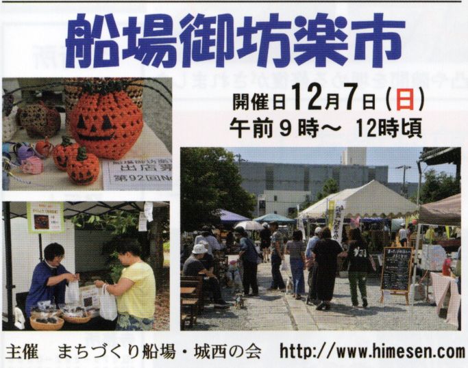 船場御坊楽市 開催日 12月7日(日) 午前9時から12時ごろまで。 主催は まちづくり船場・城西の会 http://www.himesen.com